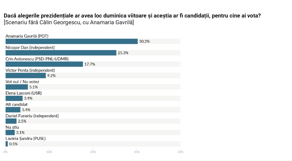 În scenariul în care Anamaria Gavrilă ar fi candidata unică a suveraniștilor, aceasta ar obține 30.2% din voturi, urmată de Nicușor Dan, cu 25.3%, Crin Antonescu – 17.7%, Victor Ponta – 9.2%, Elena Lasconi – 3.9%, în timp ce un alt candidat ar obține 3.4%. Independentul Daniel Funeriu apare și el în măsurătoare, fiind creditat cu 2.5%.