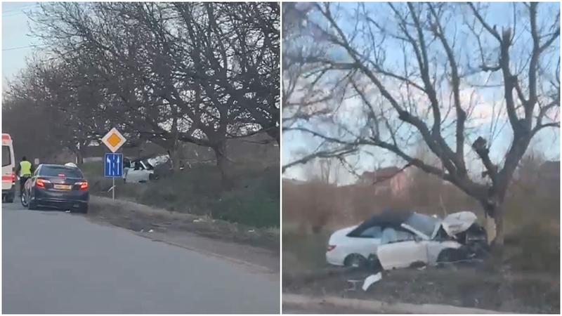 Un Mercedes decapotabil s-a izbit violent de un copac, la Budești, dis-de-dimineață: Șoferul de 19 ani, transportat la spital
